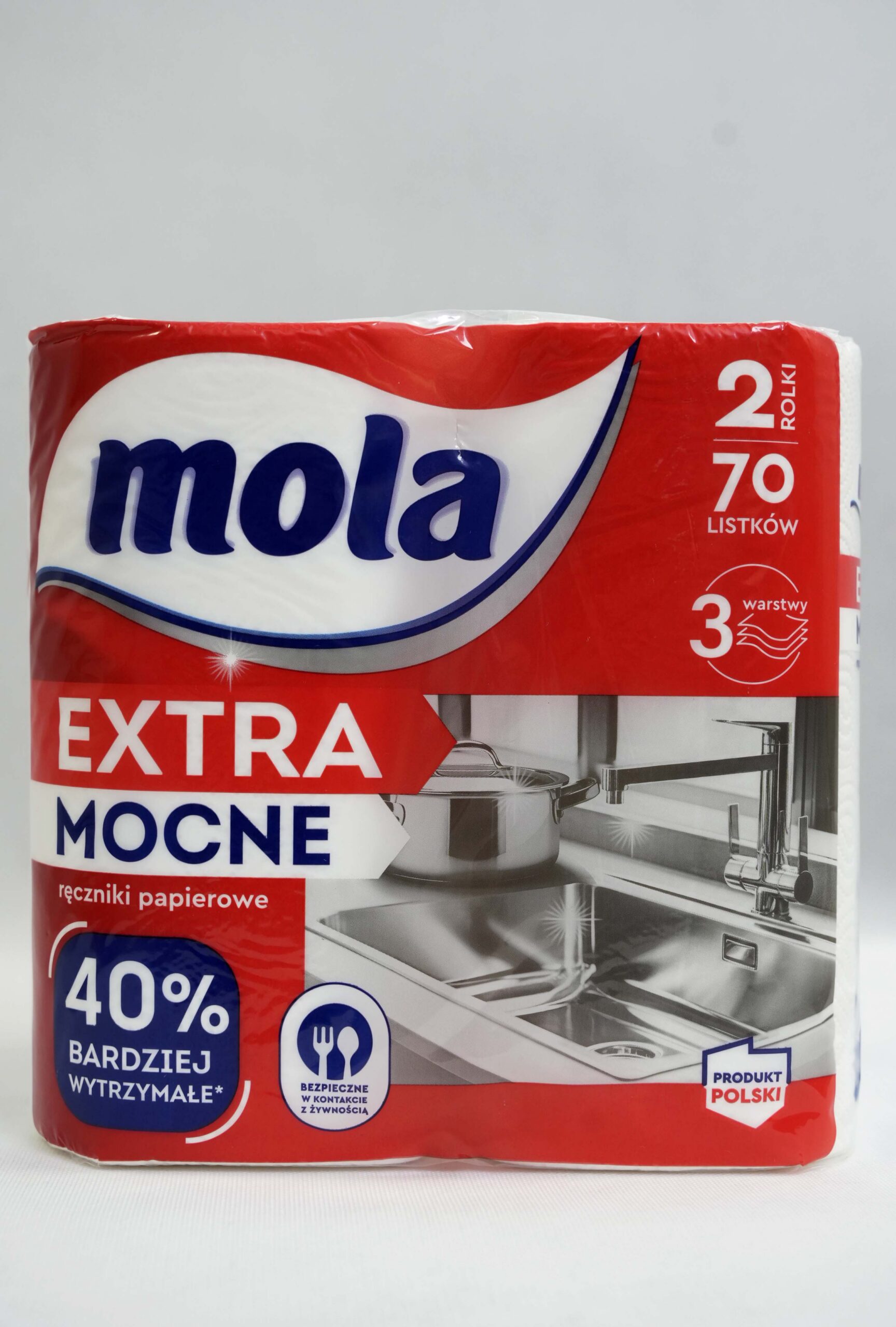 Ręczniki papierowe Mola Extra Mocne to wyjątkowo wytrzymałe, 3-warstwowe ręczniki stworzone do trudniejszych zadań kuchennych. Dzięki wzmocnionej strukturze są aż o 40% bardziej odporne na rozerwanie i idealne do kontaktu z żywnością. Opakowanie zawiera 2 rolki po 70 listków – produkt polski.