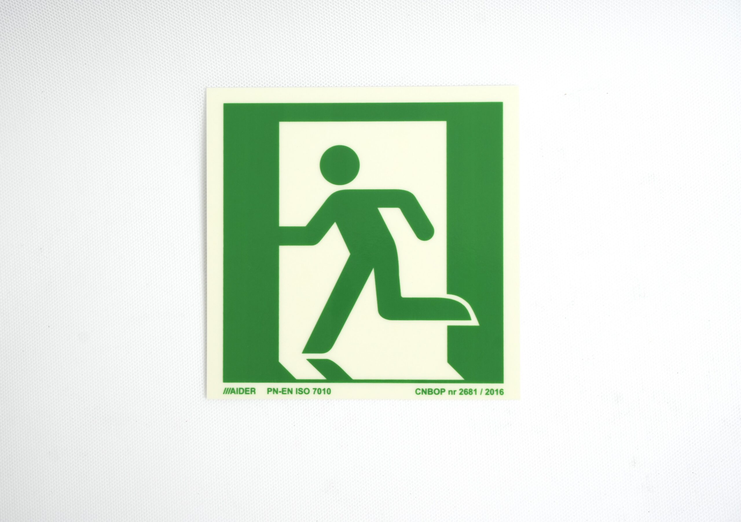 Znak ewakuacyjny AAE001 – zgodny z ISO 7010. Fotoluminescencyjny. Trwały, wysoko widoczny, łatwy w montażu.