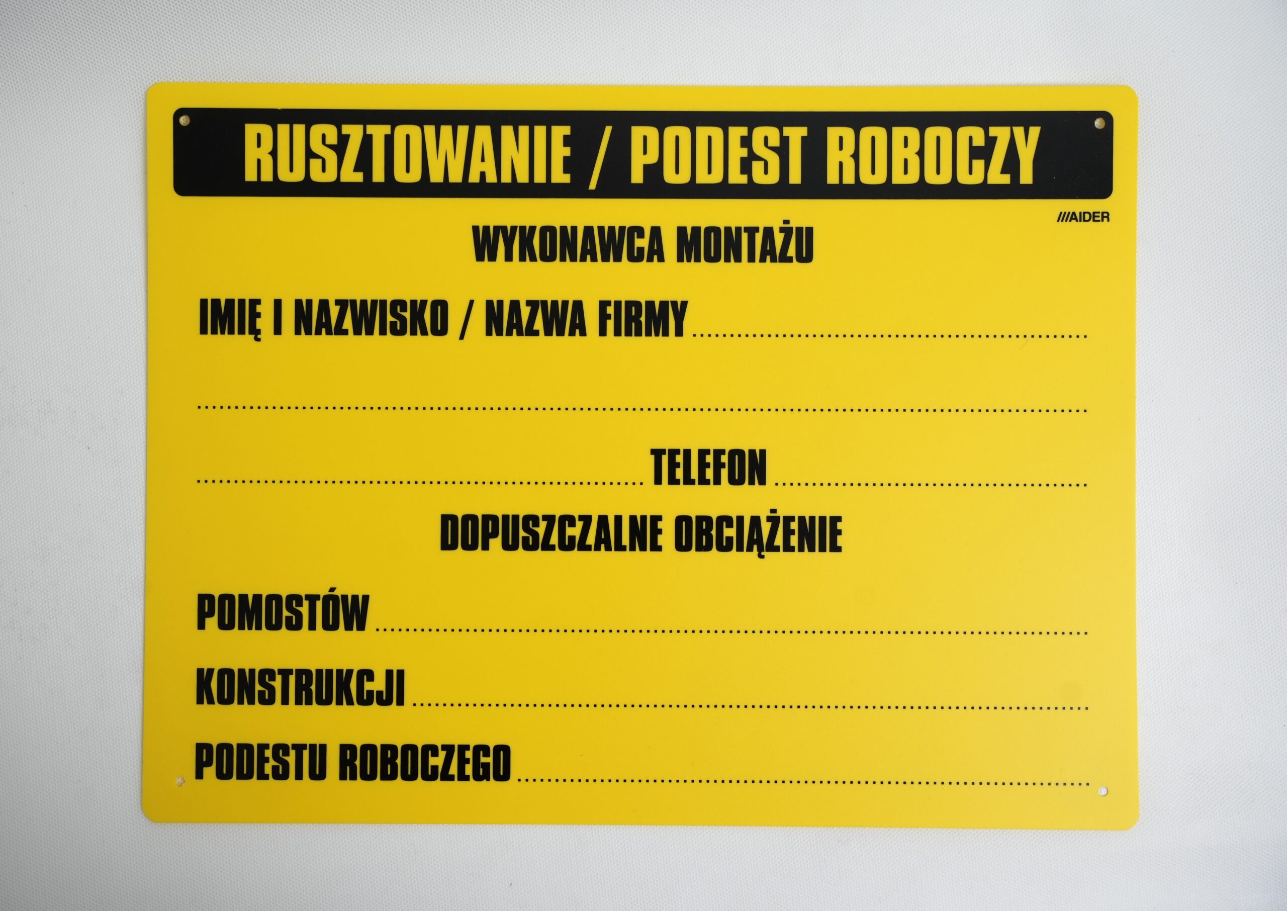 Tablica informacyjna dotycząca rusztowania lub podestu roboczego. Służy ona do przekazywania kluczowych informacji o konstrukcji i osobach odpowiedzialnych za jej montaż, co jest istotne dla bezpieczeństwa na placu budowy.